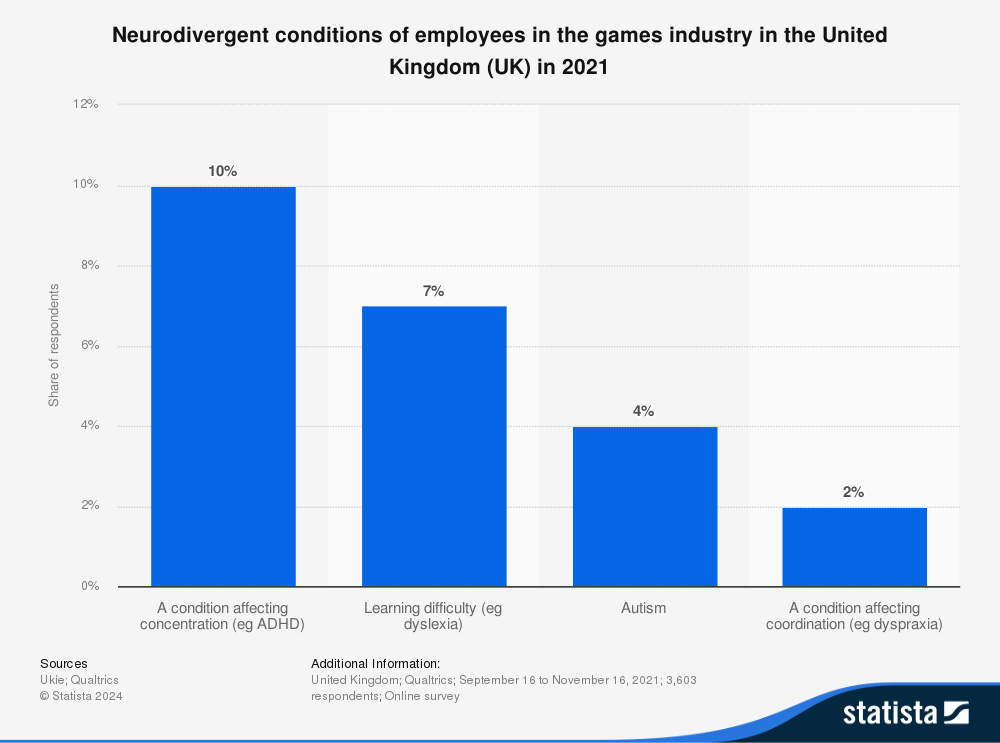 I hate to break it to people who enjoy making fun of other people, but neurodivergent people don’t just play games; a lot of them make games. According to statistics from Ukie in 2022, 18% of game developers in the UK identified as neurodivergent. which is more than 15% of the general population. 4% of people identified as autistic, which is double the amount of representation in the general population. There’s a good chance that the games you enjoy have been made with the help of a neurodivergent person, or multiple neurodiverse people.