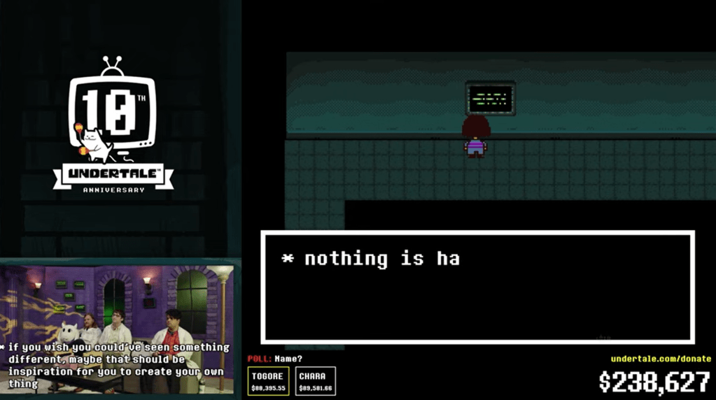 I got into UnderTale when it was a little under a year old, in late spring of 2016. So of course, when the game turned 10 years old, I had to tune in for the Fangamer UnderTale charity stream. What I was expecting was a regular playthrough of UnderTale with the added hilarity of donations being able to change the human’s name, which of course led to thousands of people wanting to name the character “Togore” after the infamous meme character, but I couldn’t have been further from the truth.
