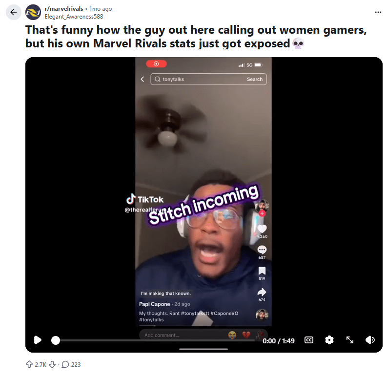 The creator of this video, CaponeVO, seems to have a reputation for being generally unpleasant to play games with, as those on the Marvel Rivals Sub Reddit are discussing how much they dislike him. And while I am glad to see men standing up for female gamers in the backlash to this video, it did highlight to me that the stereotype of certain men being unpleasant to girl gamers is still very much alive and well. The video wouldn’t have gone viral without some people agreeing with his take.